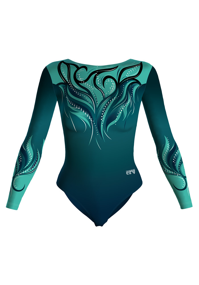 Dieser hochwertige Langarm-Turnanzug überzeugt mit einem stilvollen Farbverlauf in edlem Petrol und Türkis. Das kunstvolle, geschwungene Muster im Brust- und Ärmelbereich wird durch feine Glitzerakzente ergänzt und sorgt für einen eleganten, dynamischen Look auf jeder Trainingsfläche oder im Wettkampf. Der enganliegende Schnitt bietet optimale Bewegungsfreiheit und einen sicheren Sitz, während das weiche, elastische Material für hohen Tragekomfort sorgt. Perfekt geeignet für Turnen, Gymnastik oder Tanz.